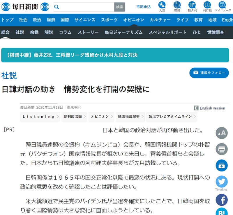 毎日新聞は、韓日議員連盟の金振杓(キム・ジンピョ)会長や韓国情報機関トップの朴智元(パク・チウォン)国家情報院長が相次いで来日し、菅義偉首相らと会談したこと、日韓議連の河村建夫幹事長らが先月訪韓したことなどに触れ、「日韓関係は1965年の国交正常化以降で最悪の状況にある。現状打開への政治的意思を改めて確認したことは評価したい」と伝えた。